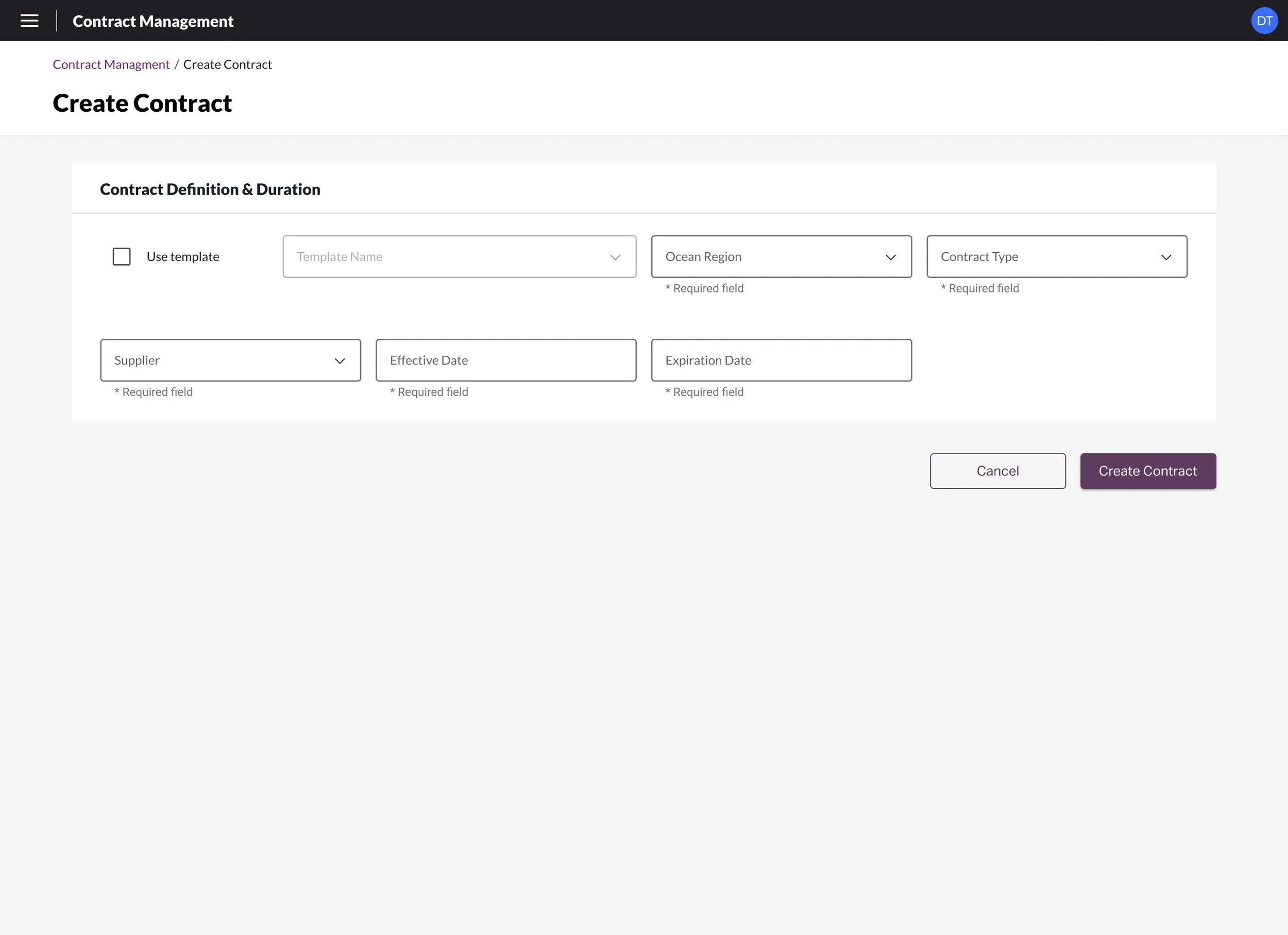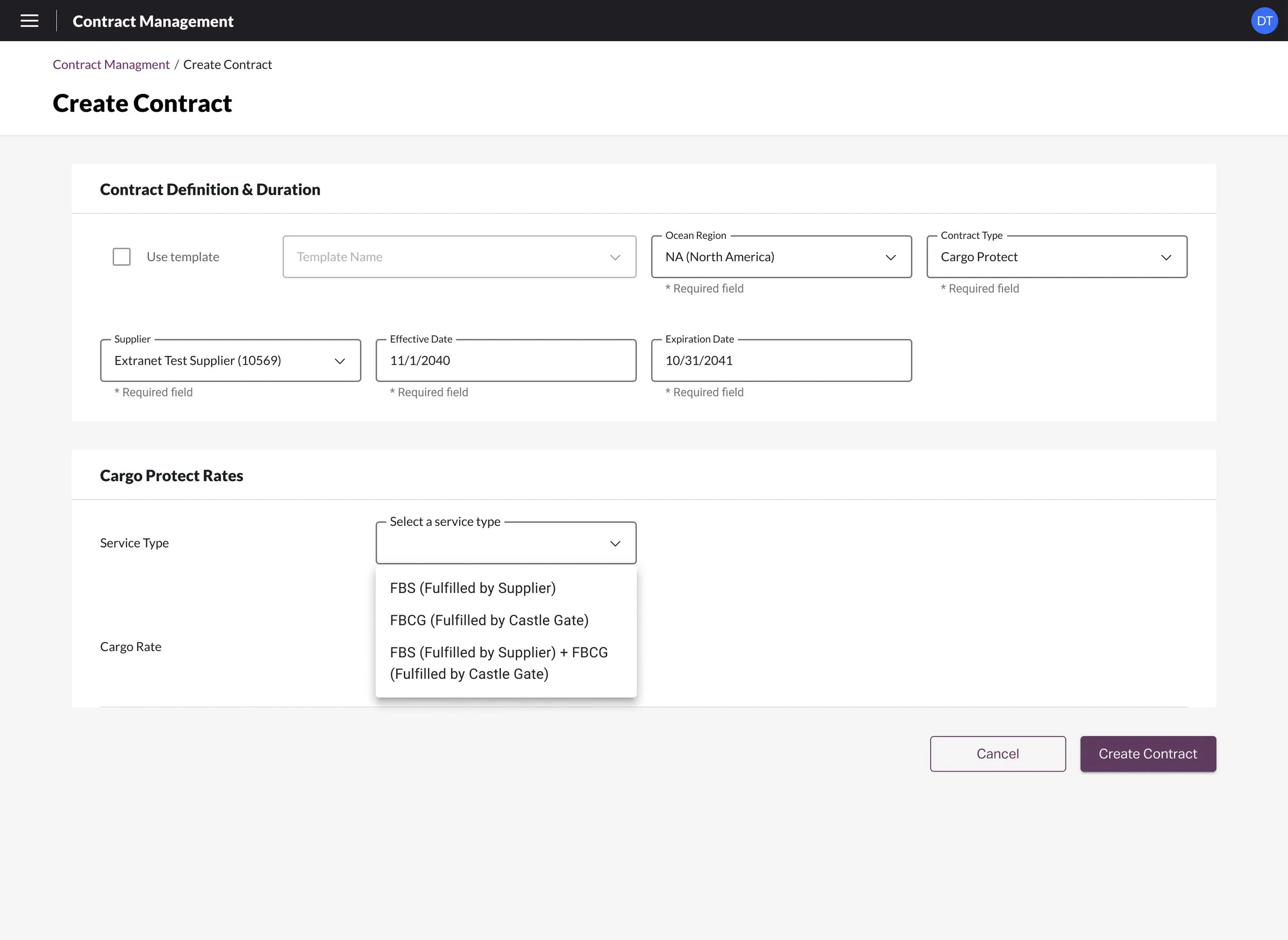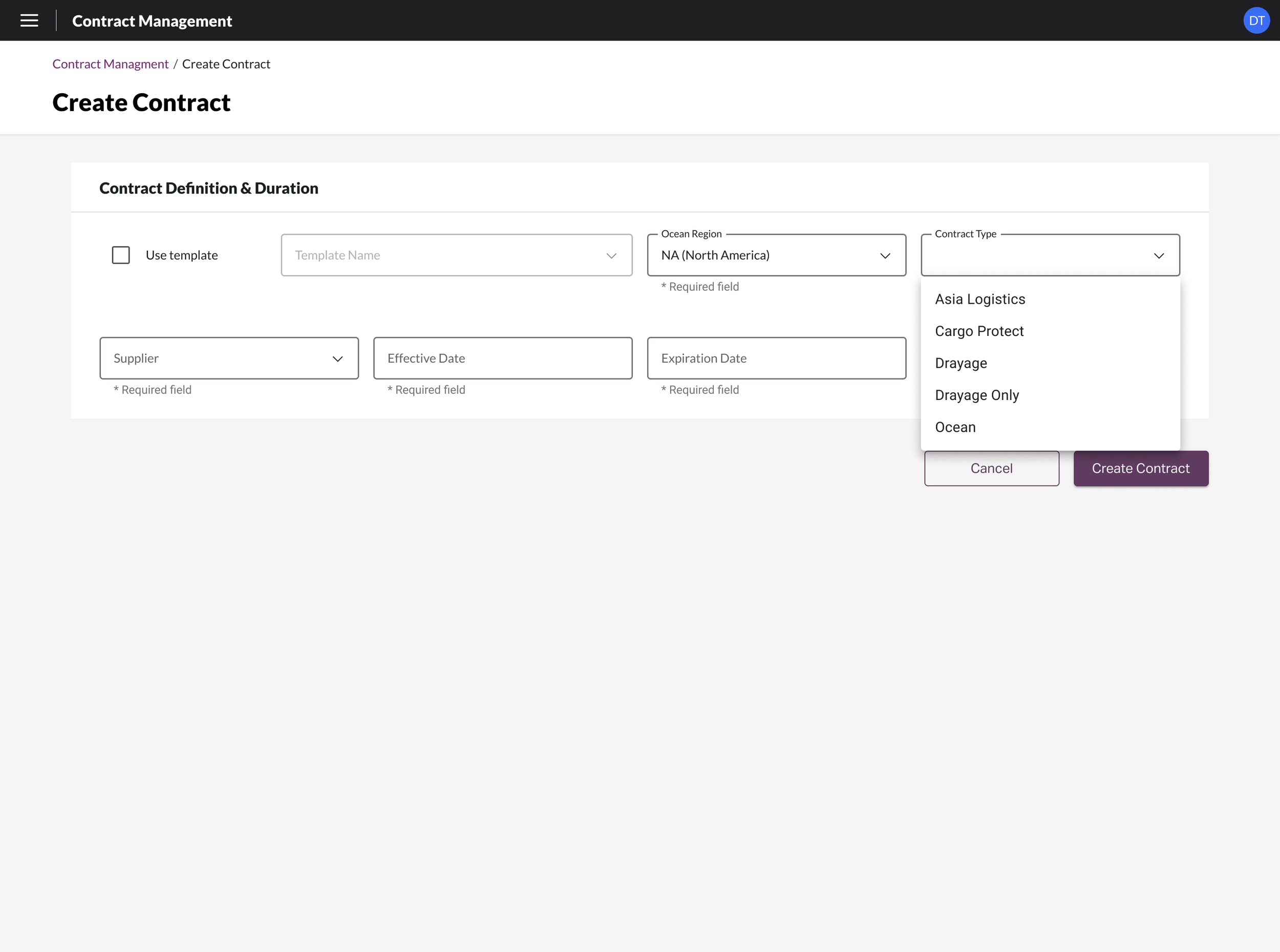 Create contracts effortlessly: Initiate the process through the familiar contract creation workflow, specifying details like supplier, ocean region, and effective and expiration dates.