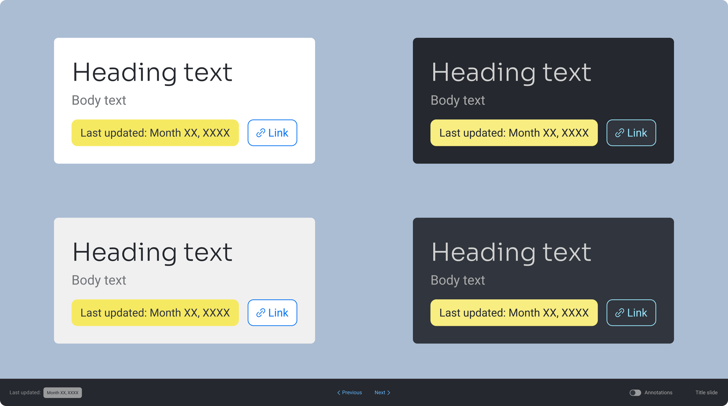 From this core component library, we also decided to create a master presentation template. This would allow designers to simply "plug-in" their content, dramatically decreasing the time spent on creating stakeholder presentations from scratch and ensuring a consistent, professional brand for the entire design organization.